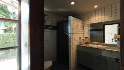 Badrummet är fräscht och rymligt med toalett och dusch samt ett stort handfat där du får plats med det mesta.
