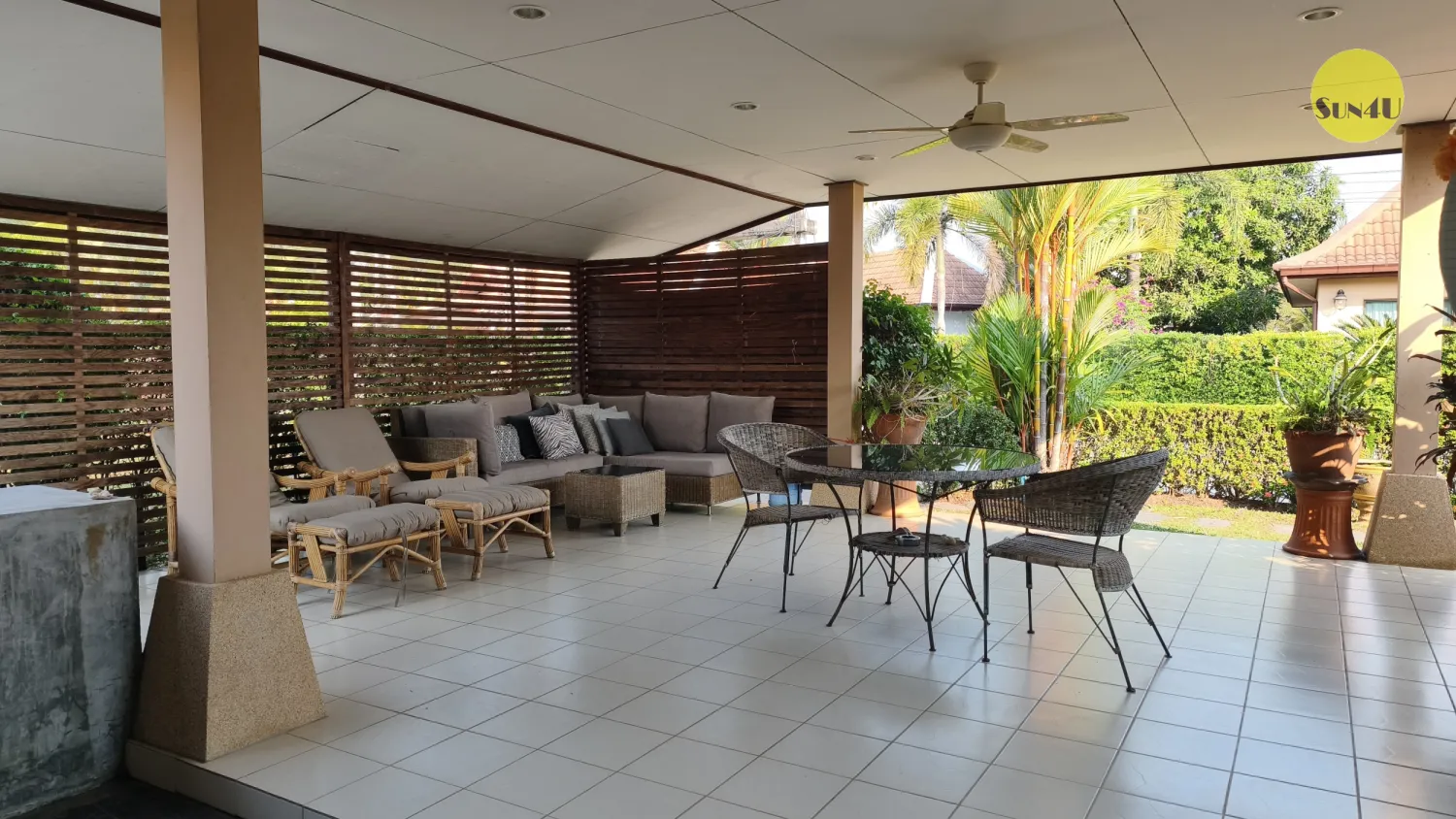 Från köket har du direkt anslutning ut till den härliga salan ( uteplatsen) där du kan starta din morgon med att avnjuta en god frukost ute i lugnet, och bara slappna av i värmen. Uteplatsen är nyligen renoverad ( 2019) . På baksidan hittar du en härlig utedusch , perfekt när man kommer från stranden !