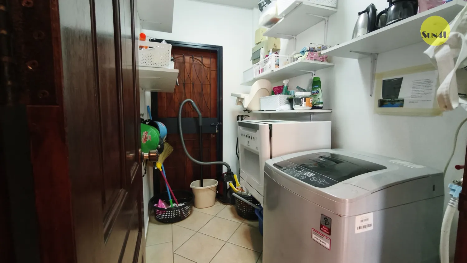 I köket finns allt du behöver , med anslutning till en tvättstuga med en modern tvättmaskin, samt en dörr ut till baksidan .