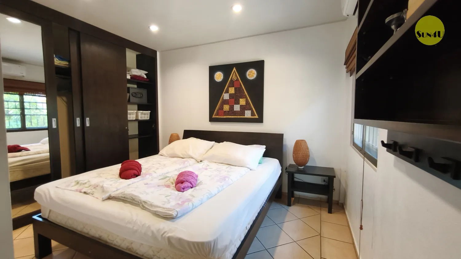 I Master bedroom har du en stor skön dubbelsäng samt en rymlig garderob med en safteybox , där du kan förvara dina värdesaker. I det andra sovrummet hittar du 1 enkelsäng och en våningsäng, (3bäddar) Samt 2 rymliga garderober.